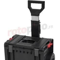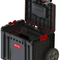 - Caisse à outils mobile avec roulettes PRO CART – un coffre de taille moyenne sur roues avec un plateau amovible offre un grand espace de rangement et un siège solide.