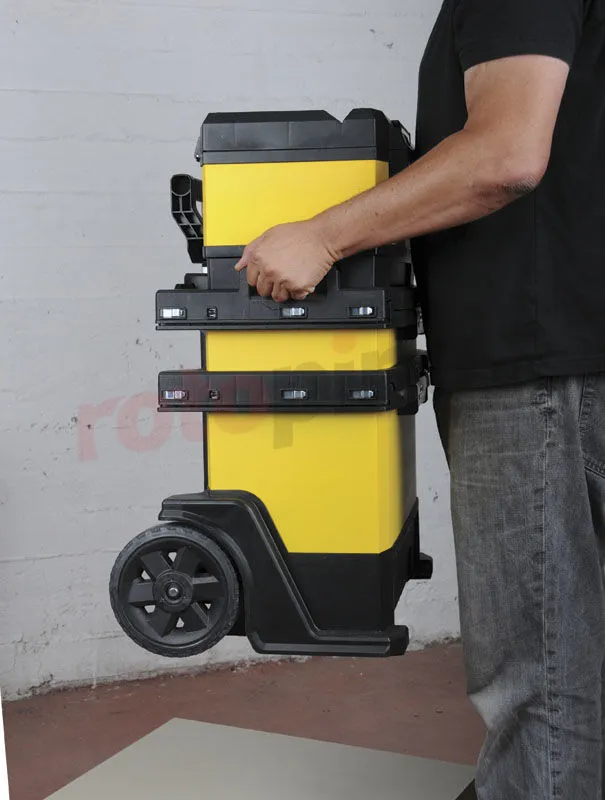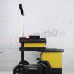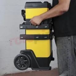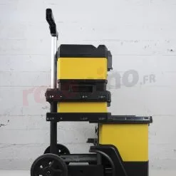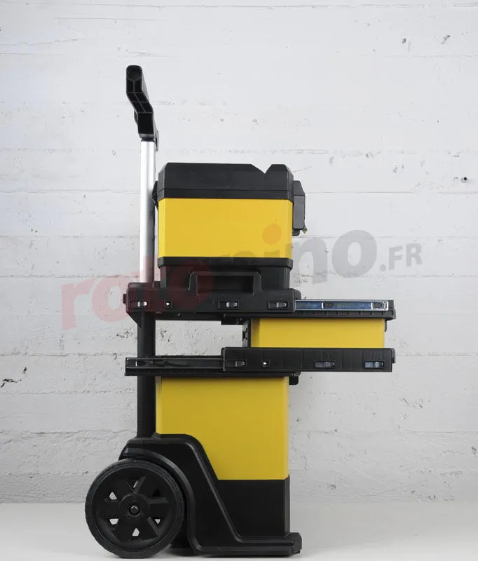 - Roues de transport et la poignée télescopique assurent un mouvement confortable avec un chariot rempli d’outils