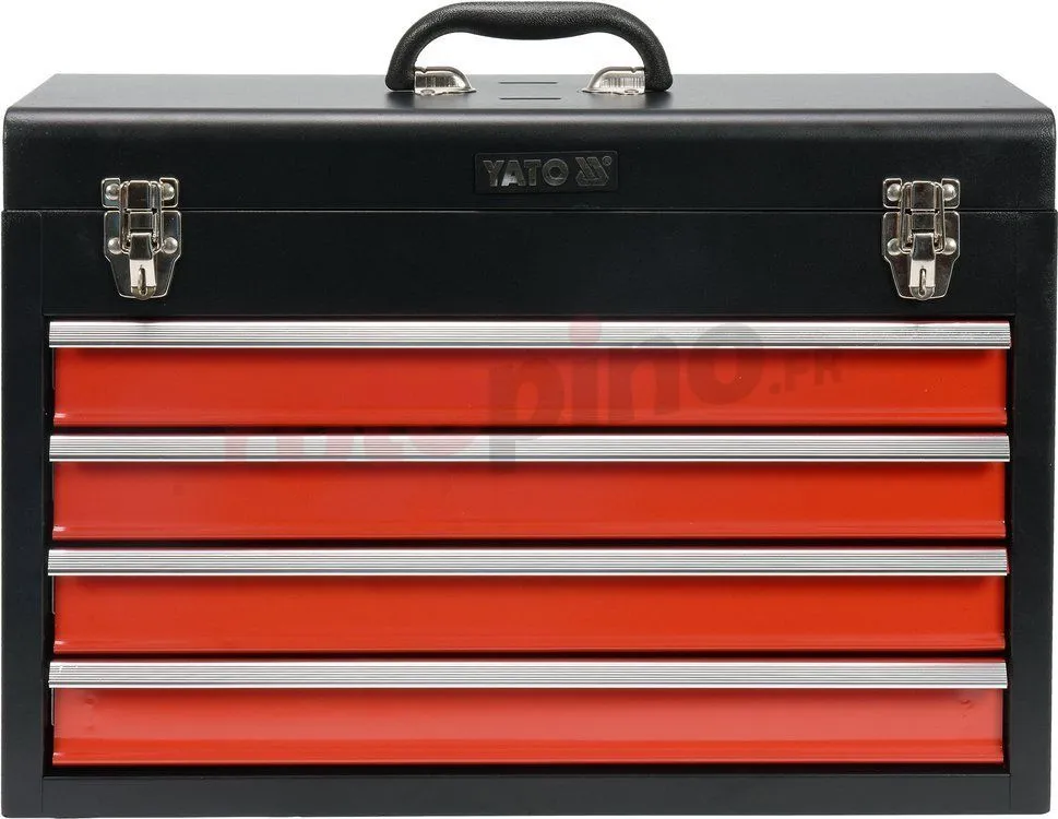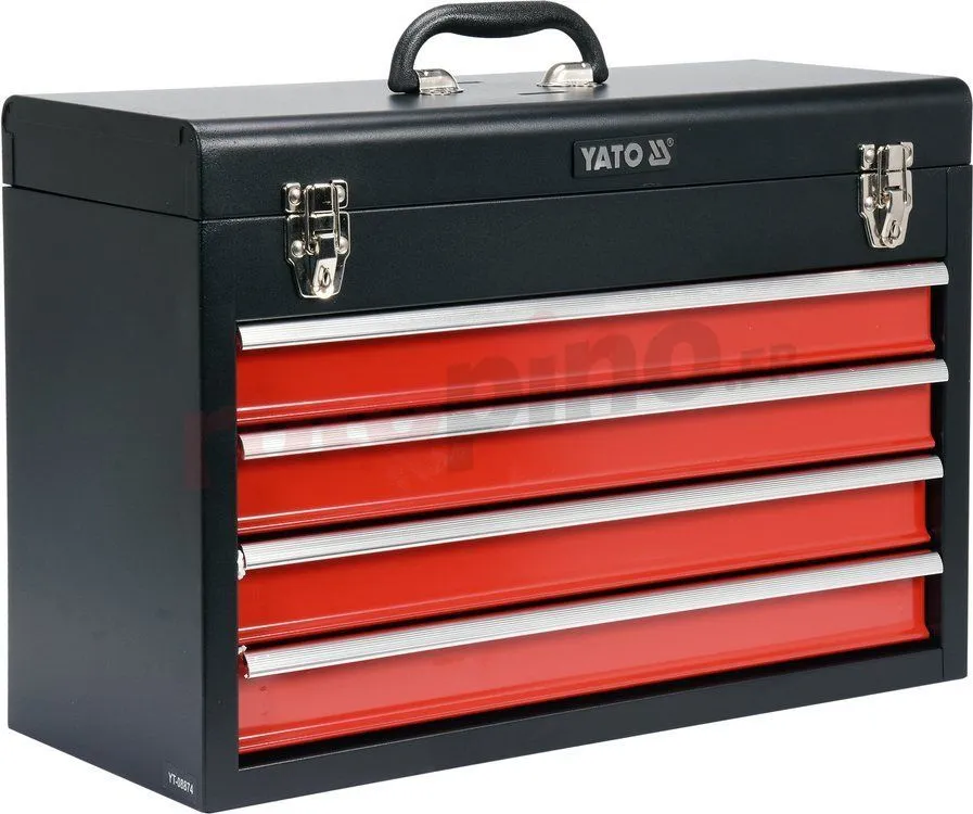 La boîte à outils avec 4 tiroirs Yato YT-08874 permet de ranger des outils manuels. Grâce aux tiroirs, qui peuvent être librement agencés par l’opérateur, l’accès aux outils est considérablement simplifié. Les tiroirs sur les glissières à roulement à billes fonctionnent très bien. De plus, la boîte a un compartiment supérieur avec des loquets métalliques. Le tout peut être sécurisé avec un cadenas. Le verrouillage central des tiroirs est activé lorsque le couvercle est fermé. La boîte à outils peut être facilement transportée grâce à la poignée confortable.