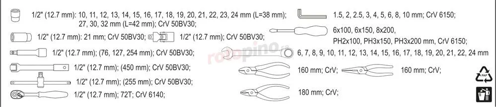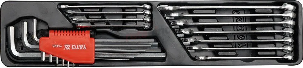 - Clés plates à oeil : 6, 7, 8, 9, 10, 11, 12, 13, 14, 15, 16, 17, 18, 19, 20, 21, 22, 24 mm