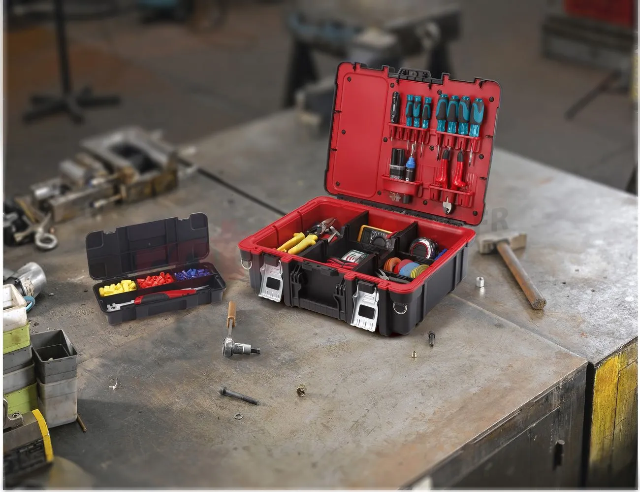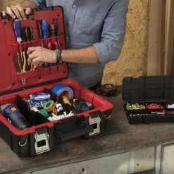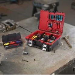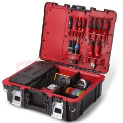 Boîte Technican Box est une boîte à outils solide qui se distingue par sa grande capacité et sa conception compacte. Un avantage supplémentaire est son design moderne, qui combine des couleurs contrastées : noir et rouge avec des éléments métalliques. Il y a deux organisateurs à l’intérieur. L’un d’eux peut être facilement retiré, ce qui est très pratique pendant le travail. Le rabat supérieur comporte un emplacement dédié aux tournevis, pinces et autres appareils similaires. La structure solide de la boîte permet d’y transporter des appareils de mesure délicats, sans craindre de les endommager. La Technican Box est fabriquée à partir de matériaux de haute qualité, de sorte que le boîtier n’est pas sujet à la casse. Il a des poignées qui vous permettent d’y attacher une bandoulière. De plus, la boîte a été équipée de loquets métalliques durables qui vous permettent de transporter la boîte sans craindre que le contenu de la boîte tombe et soit endommagé pendant le transport.