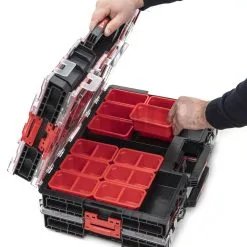 - Rails en polycarbonate sur le couvercle – la conception du couvercle permet une fixation facile et rapide d’autres organisateurs L et M.