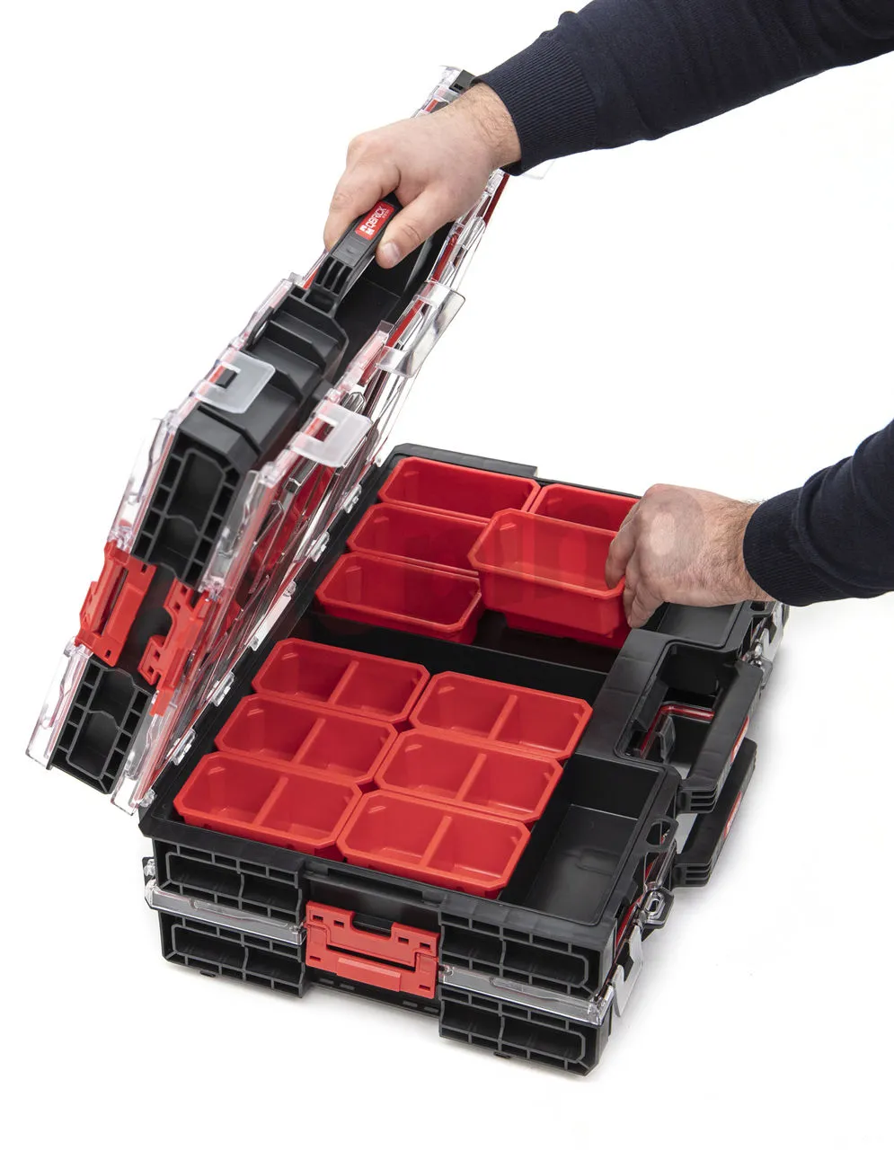 - Transparence en polycarbonate – couvercle résistant aux chocs, suffisamment flexible et complètement transparent maintenant les compartiments en place.