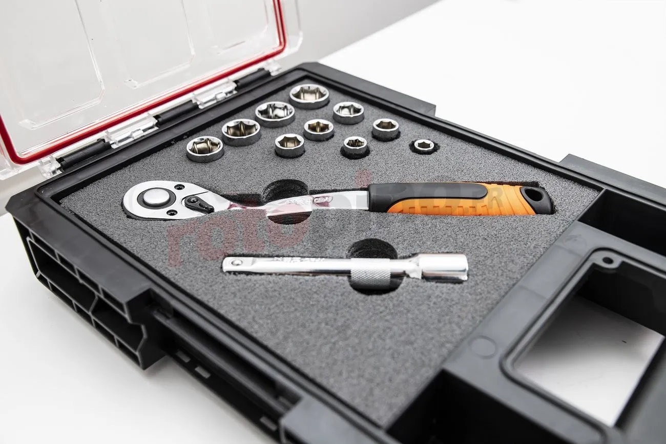 Remplissage de mousse – 2 feuilles de mousse dans les dimensions de la chambre principale permettent un ajustement optimal de l’intérieur, par exemple, des ensembles d’outils à main avec accessoires