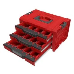 La caisse à outils modulaire PRO RED Ultra HD DRAWER 3 TOOLBOX EXPERT Qbrick System SKRQPROD3ECZEPG001 offre la plus grande durabilité et qualité ainsi qu’une fonctionnalité digne des boîtes à outils les plus professionnelles. Des guides métalliques en trois parties permettent d’étendre complètement le tiroir sans risque de le casser. Le mécanisme qui libère le verrou coulissant est un bouton très simple d’utilisation qui se trouve à l’endroit de prise en main « normale » d’ouverture d’un tiroir. Le verrouillage est sécurisé automatiquement. L’intérieur dispose de 3 cloisons amovibles, et dans la version Expert il est équipé d’un ensemble de 21 seaux analogues à ceux des organisateurs PRO 100 et 200 et ONE L et M. Grâce à la cohérence du système, la boîte peut être fixée au série PRO et ONE avec couvercles VARIO 2.0 et adaptateur multiple. Le matériau extrêmement durable et la conception bien pensée garantissent durabilité et fiabilité. Ainsi, le Drawer rouge est une opportunité unique pour transférer la fonctionnalité d’un atelier stationnaire sur des chantiers de construction avec des conditions de travail extrêmes. L’accès facile à trois tiroirs configurables aide le travail des monteurs, électriciens, mécaniciens et autres professionnels utilisant de nombreux outils à main, petits accessoires et autres consommables.
