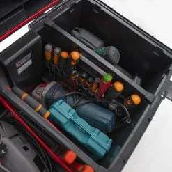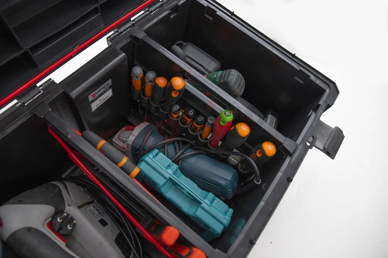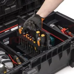 La cloison amovible Z254539PG001 avec supports pour outils manuels permet de mieux organiser l’intérieur des caisses Qbrick system ONE en taille 350 et des coffres à roulettes longues ONE LONGER. La cloison a 12 petites boucles en plastique et 4 boucles larges, sur lesquelles il y a des encoches pour placer par exemple pour un mètre à ruban. Le pied large de la cloison permet de la placer à l’extérieur du caisson, par exemple sur le chantier. C’est un excellent complément du système, permettant une adaptation rapide de la caisse aux besoins du jour.