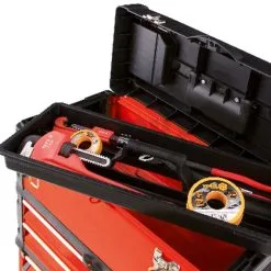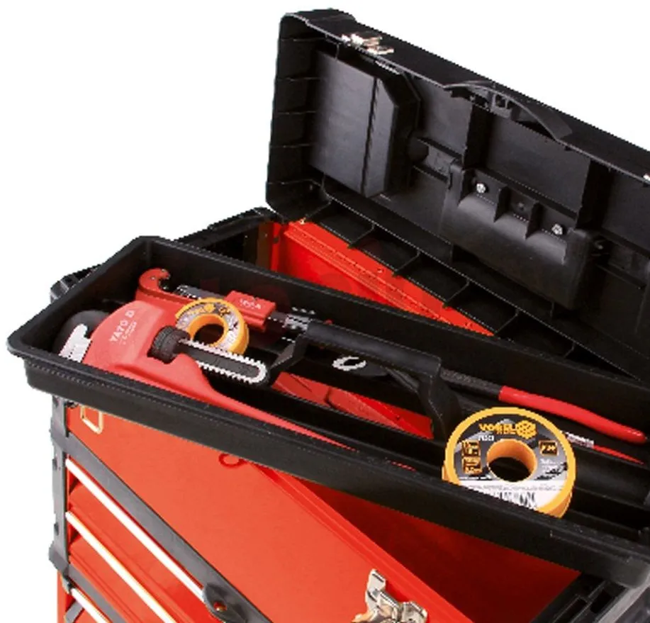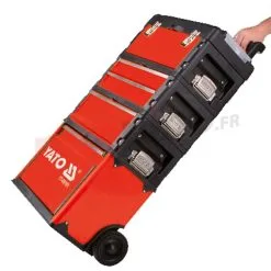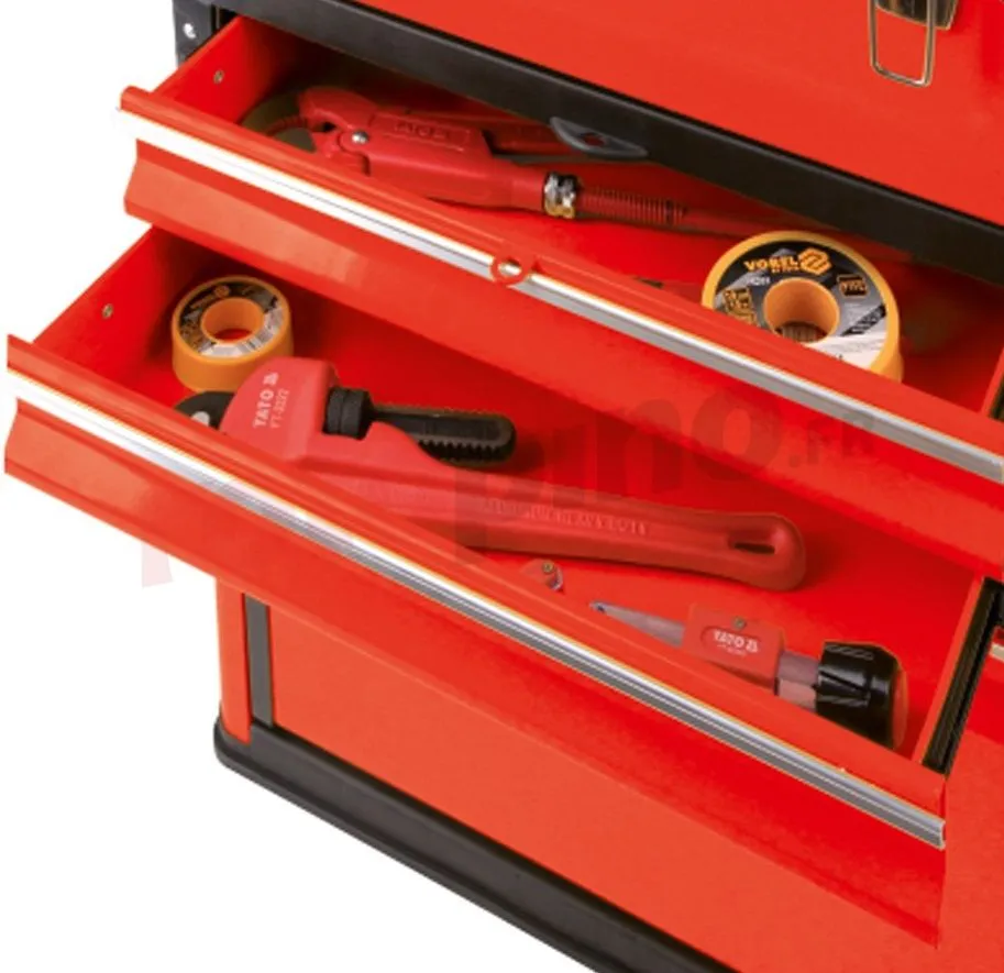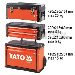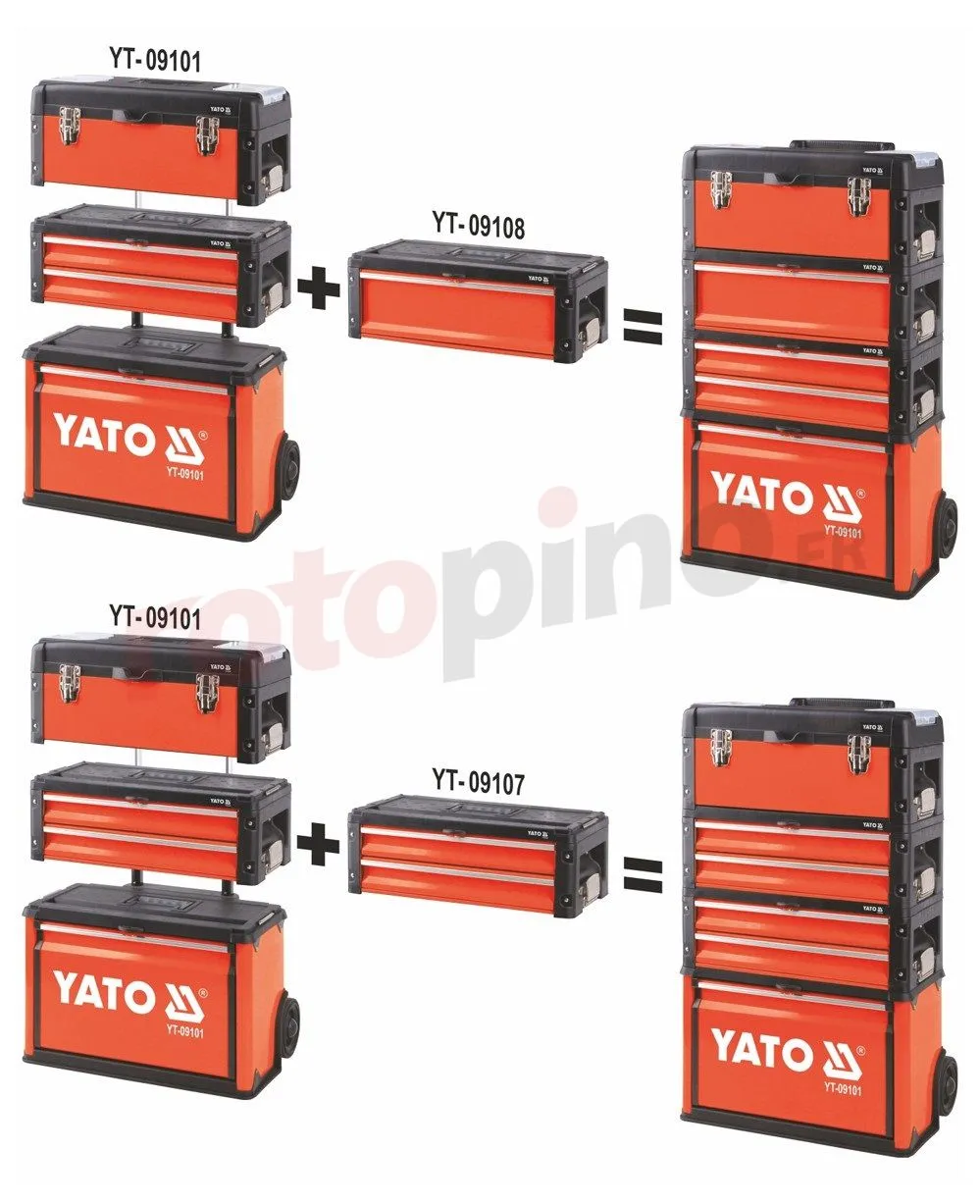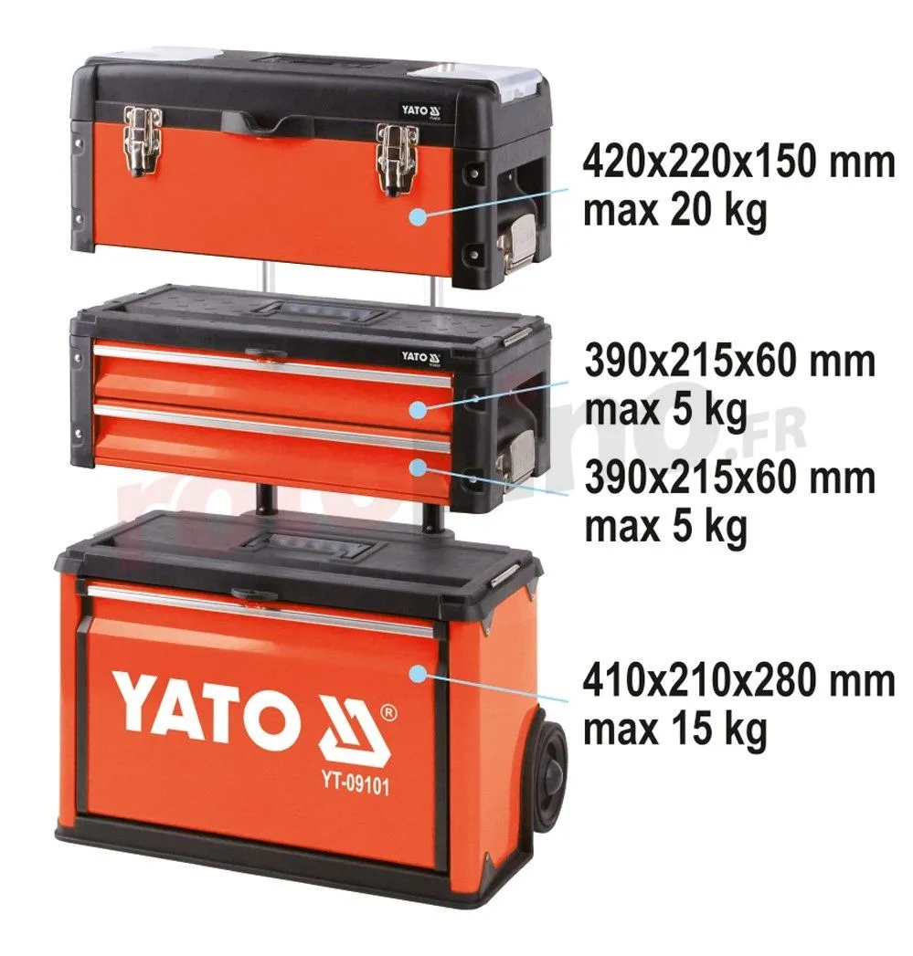 Chariot à outils avec modules Yato YT-09101 Dispose de 3 segments, qui peuvent se connecter et déconnecter, selon besoin . Dépôt YT-09 101 peut être étendue à un ensemble de 4 par de module central modulaire YT-YT-09 107 ou 09 108. Grâce à la protection contre l’éjection de tiroirs le chariot peut être transporter dans votre voiture sans crainte de tomber d’un des segments.