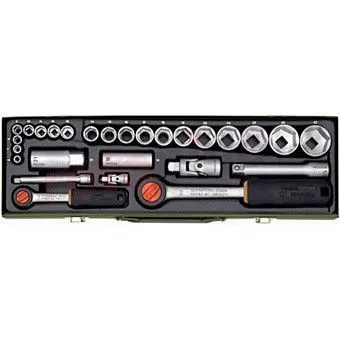 Jeu pour toutes les vis automobiles courantes – douilles de 6 à 32 mm, douilles de bougie de 16 et 21 mm. Boîte en métal très stable recouverte de technique de revêtement en poudre, avec un insert en plastique pressé.
