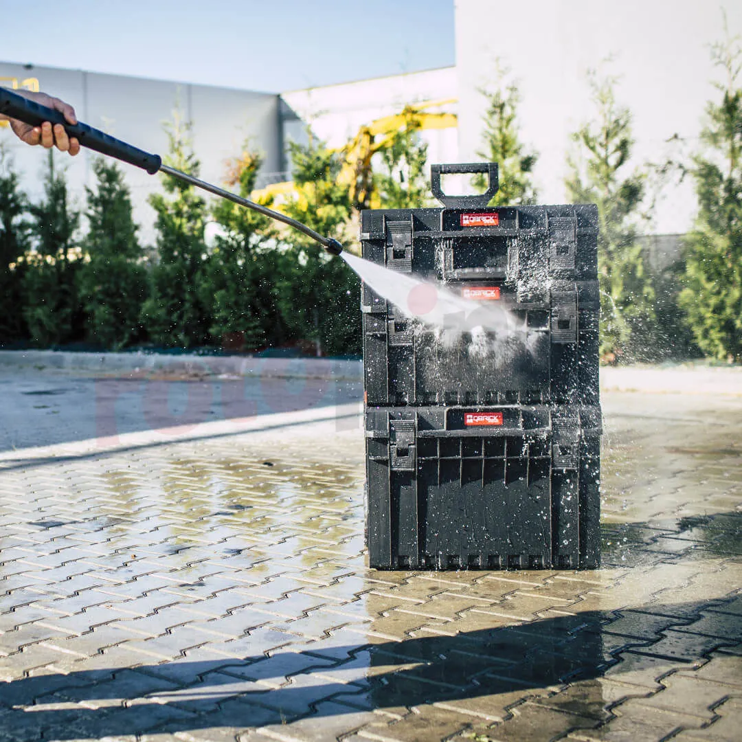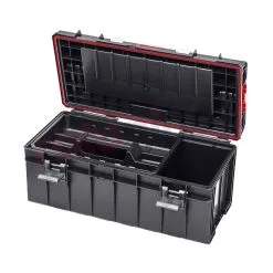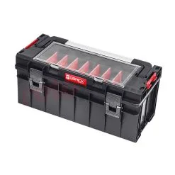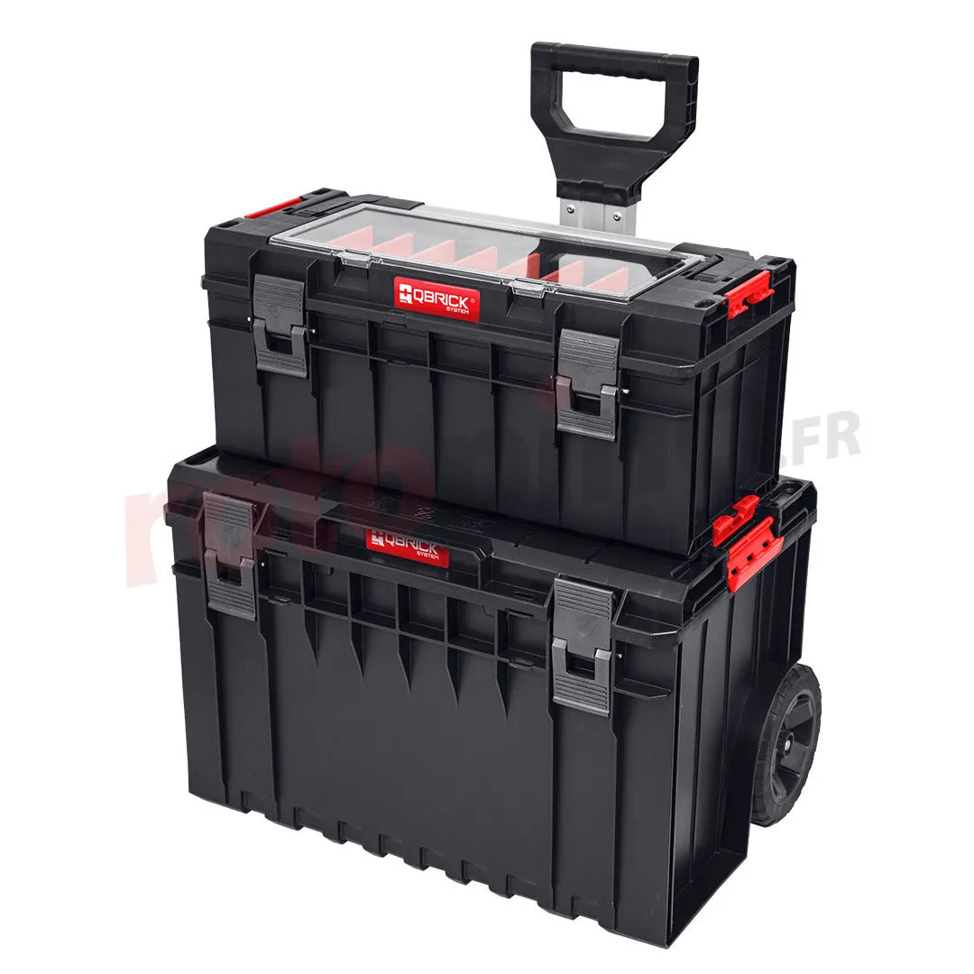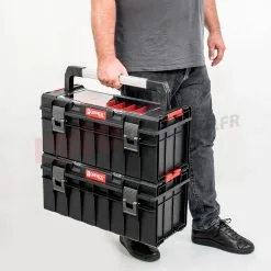 L’atelier mobile PRO 600 EXPERT + ONE CART Le Qbrick Z251101PG001 est un ensemble d’étui à roulettes ONE CART et de boîte à outils PRO 600. La base de l’ensemble est un étui très spacieux avec de grandes roues et une poignée télescopique. Il offre une excellente manoeuvrabilité même d’un système étendu entièrement chargé. Le couvercle de la caisse mobile a 3 paires de connecteurs pour attacher d’autres caisses. Les crochets les plus espacés sont utilisés pour fixer les valises avec Qbrick System ONE. Deux travaux plus près du centre du couvercle concernent les troncs PRO 500 et 600 dans les versions organisateur et BASIC. Le coffre supérieur est une valise relativement grande avec un organiseur pratique sur le couvercle et une poignée solide et un plateau amovible. Il est complètement chargé, il peut reposer sur le boîtier de roue, mais il peut également être facilement transporté à deux mains. Il est idéalement adapté au lieu de travail, car il vous permet de stocker une grande quantité d’accessoires et de consommables. Il peut être facilement étendu avec d’autres boîtiers QS de la gamme ONE ou PRO.
