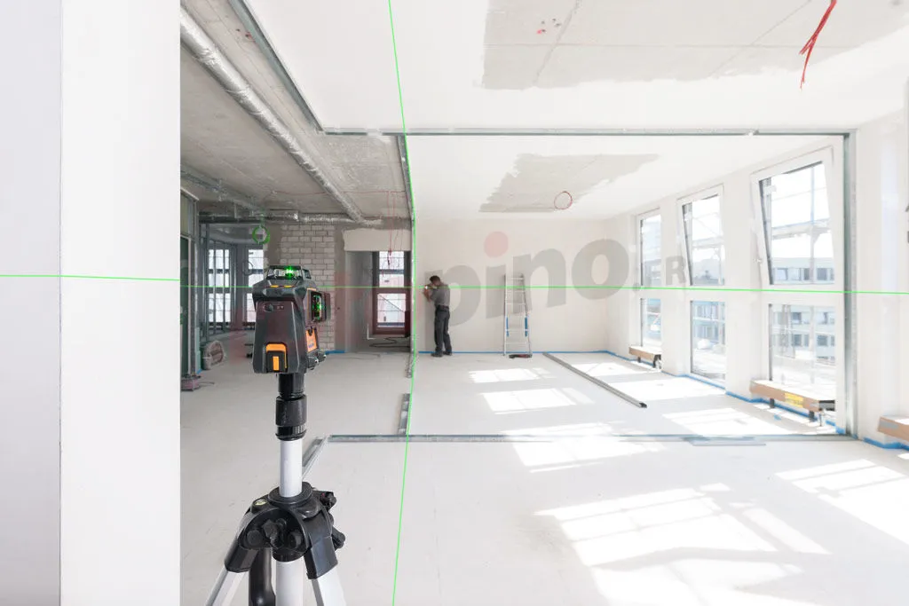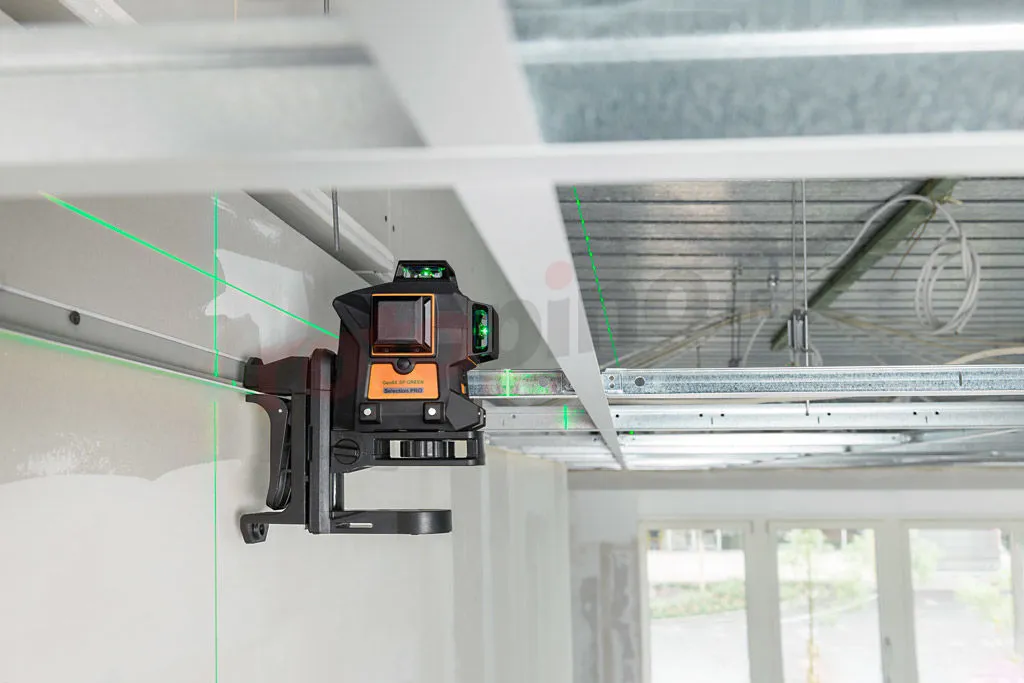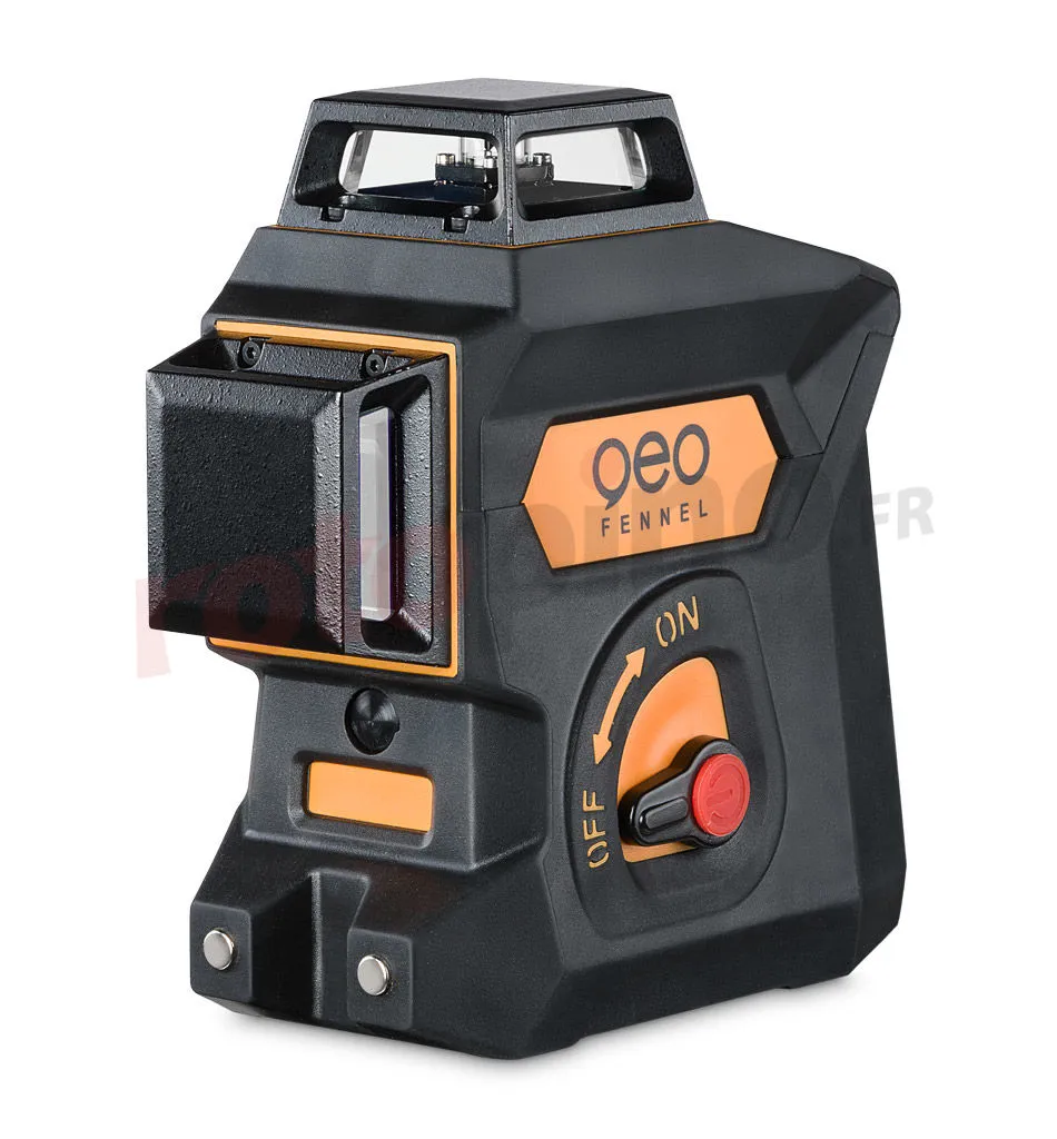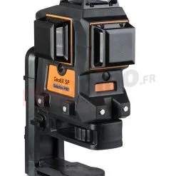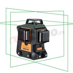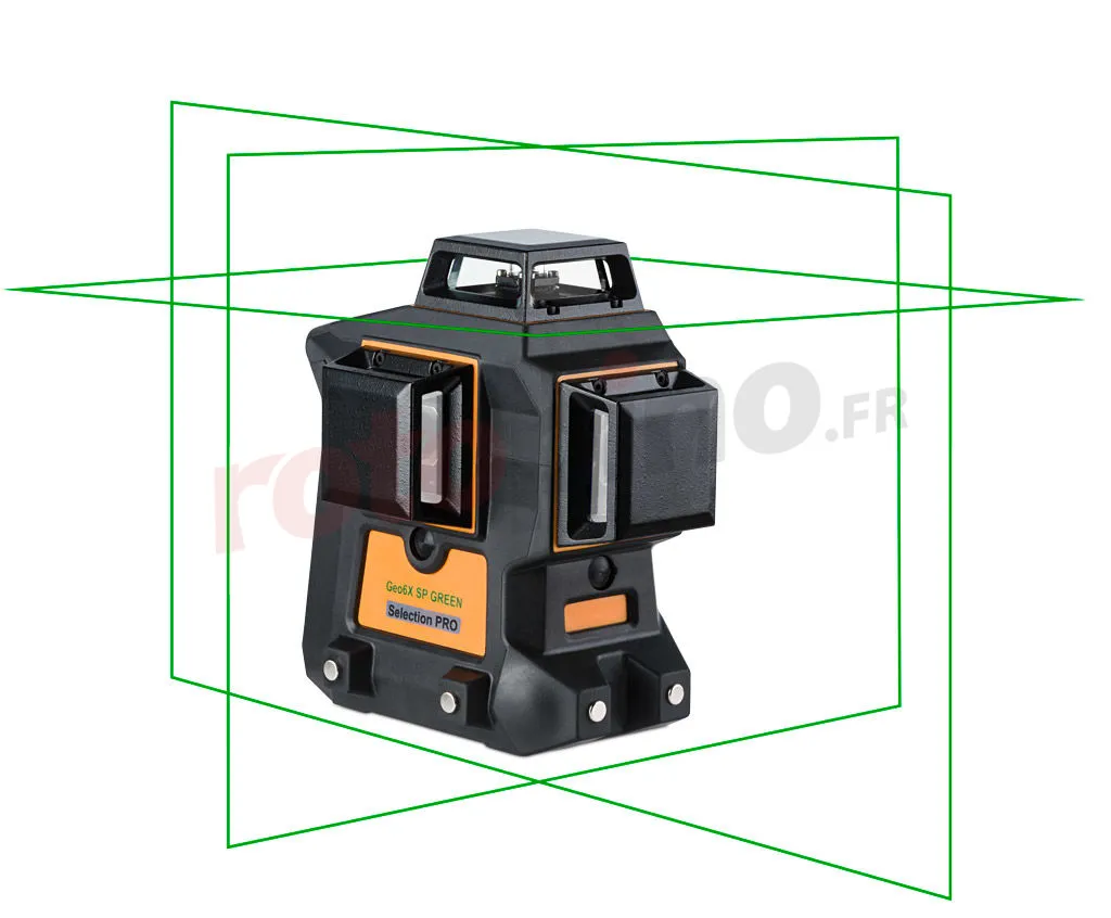 - Six croix laser positionnées à angle droit – permettent de déterminer les niveaux, les aplombs et les angles droits