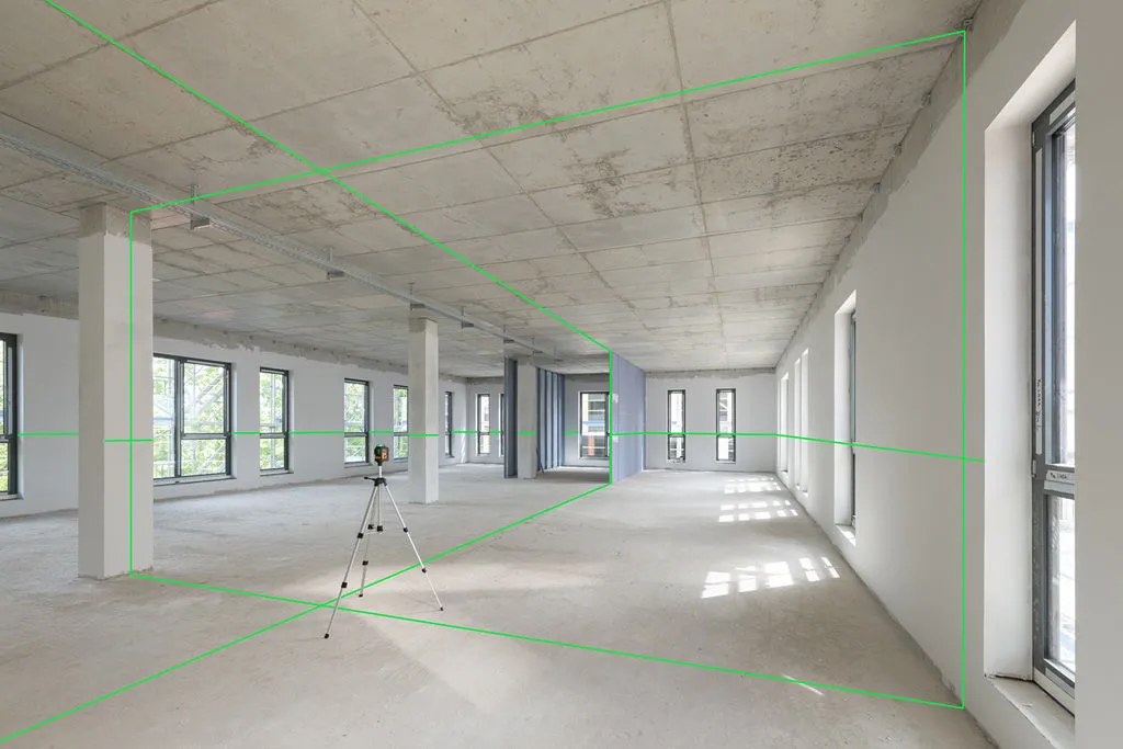 - Trois faisceaux laser à 360° – précis et clairs – ligne de niveau et deux lignes à plomb visibles simultanément sur tous les murs, sol et plafond.