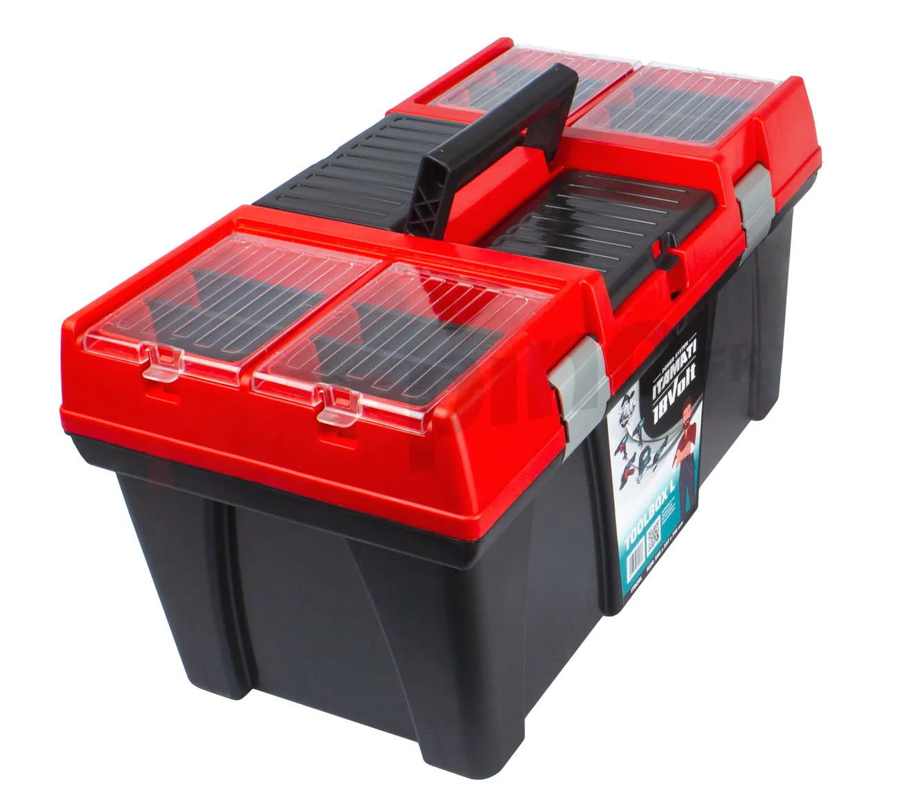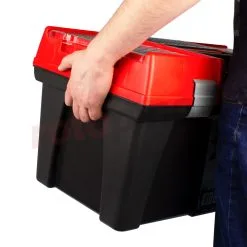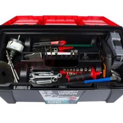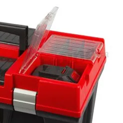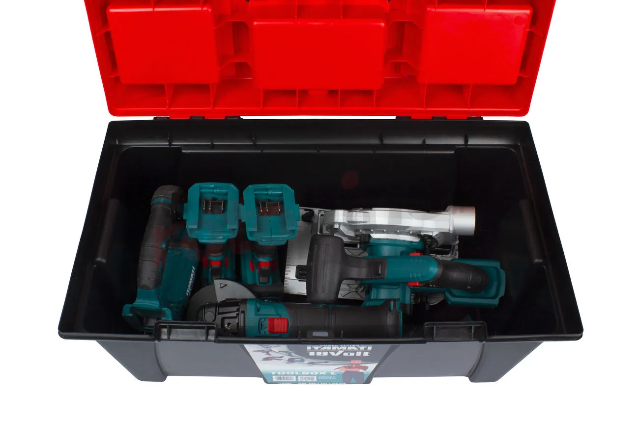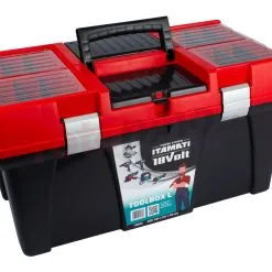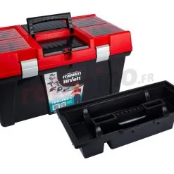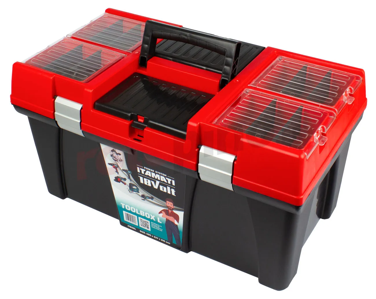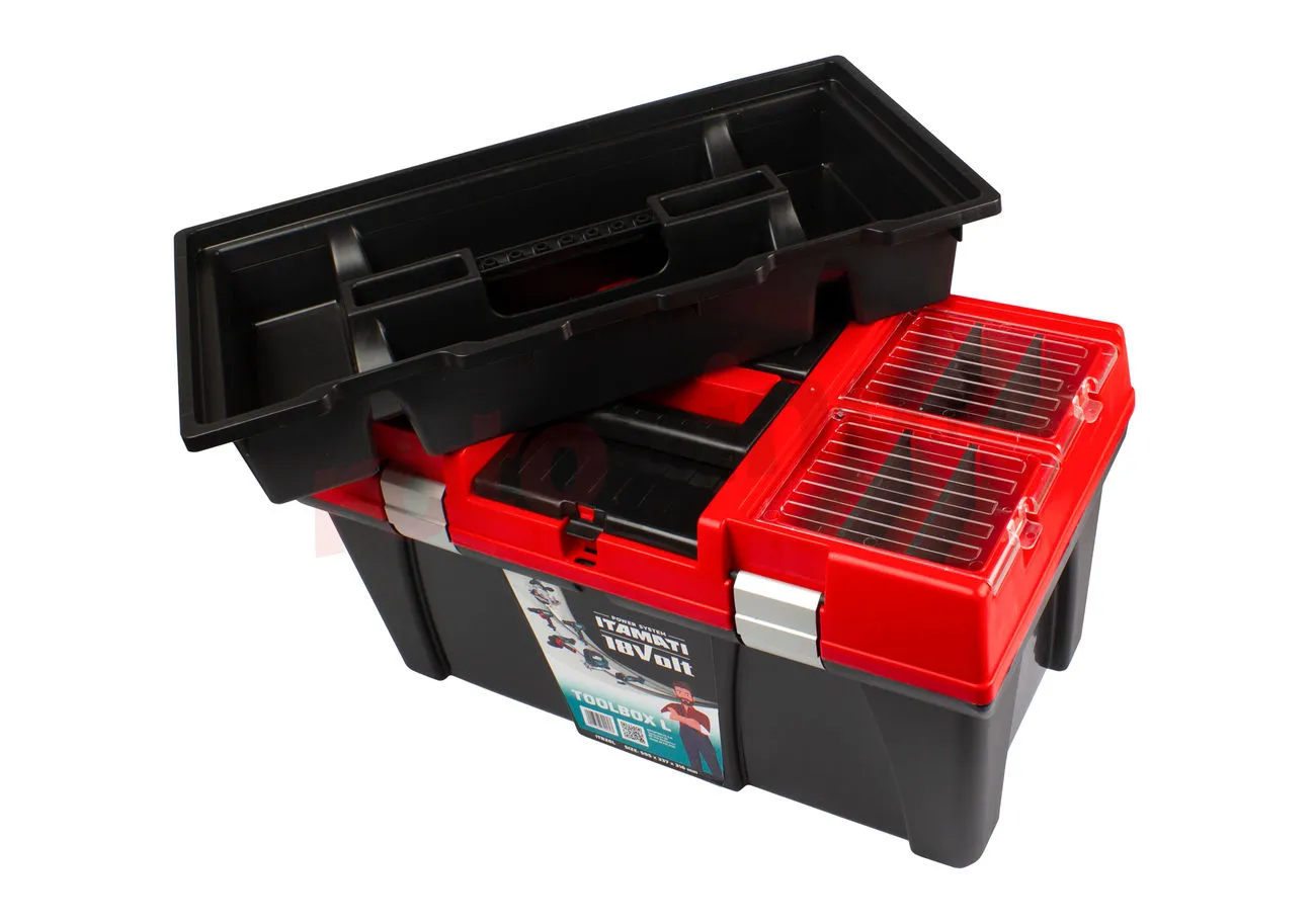 La boîte à outils TOOLBOX L Itamati ITB26L est une caisse idéal pour chaque garage, atelier ou coffre de voiture. Le coffre spacieux contient la plupart des types d’outils électriques et d’outils à main. Les grandes dimensions de la boîte fournissent un abri pour des équipements tels qu’une meuleuse d’angle, un tournevis, une scie sauteuse et même une scie circulaire ou une scie queue renard. De plus, le stockage de la plupart des marteaux, scies, pinces et clés n’est pas un problème. Le plateau à outils est parfait pour mesurer les outils, les batteries, les accessoires et l’équipement. La poignée du plateau a des fentes pour les embouts de vis et de petits compartiments pour les boulons, les écrous ou les vis. En conséquence, il est parfait pour le lieu de travail, où il est un endroit sûr pour les éléments démontés, les outils précieux, les mèches, les perceuses ou les lames de scie. Un véritable trésor de bibelots est le couvercle de la boîte avec 6 organisateurs. Les quatre plus grands sont équipés de volets en polycarbonate très résistants et de deux compartiments amovibles. Ces chambres donnent une grande liberté pour organiser les accessoires et consommables, et les rabats transparents assurent la visibilité du contenu. L’organisateur sous la poignée pliante est un récipient peu profond divisé en 6 petits bols, tandis que l’opposé est un espace plus profond, par exemple pour un téléphone, des gants, des lingettes hygiéniques ou humides, un sandwich ou un bar. En plus de soulever la poignée supérieure, il existe une possibilité de préhension à deux mains sur les bords les plus courts de la boîte. Il existe des évidements spéciaux utiles pour soulever une caisse fortement chargée ou la tirer sur le sol. La boîte Itamati est fermée par deux attaches en aluminium. Ils sont solides, durables et très faciles à utiliser. La boîte a été conçue pour les utilisateurs d’outils électriques sans fil ITAMATI PowerSystem 18Volt, de sorte que la capacité du boîtier, les dimensions du plateau et des organisateurs correspondent parfaitement aux machines et à leurs accessoires. L’espace de la boîte ITB26L répondra aux besoins de tout amateur de bricolage avec ses propres outils.