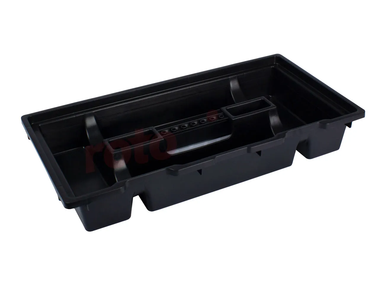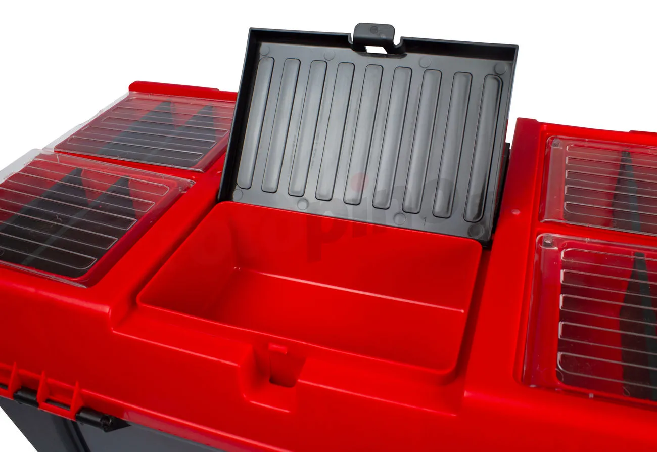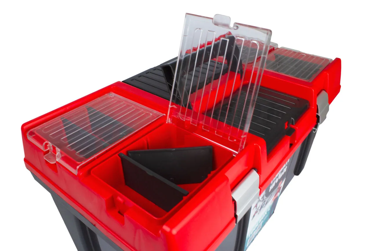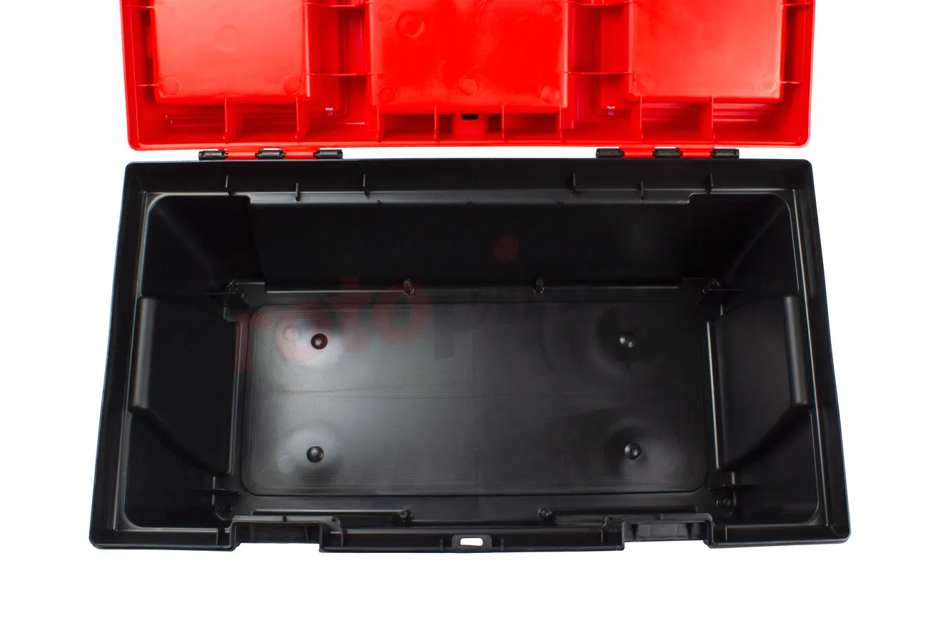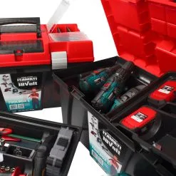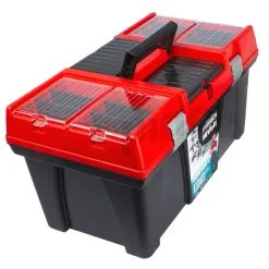 La boîte à outils TOOLBOX L Itamati ITB26L est une caisse idéal pour chaque garage, atelier ou coffre de voiture. Le coffre spacieux contient la plupart des types d’outils électriques et d’outils à main. Les grandes dimensions de la boîte fournissent un abri pour des équipements tels qu’une meuleuse d’angle, un tournevis, une scie sauteuse et même une scie circulaire ou une scie queue renard. De plus, le stockage de la plupart des marteaux, scies, pinces et clés n’est pas un problème. Le plateau à outils est parfait pour mesurer les outils, les batteries, les accessoires et l’équipement. La poignée du plateau a des fentes pour les embouts de vis et de petits compartiments pour les boulons, les écrous ou les vis. En conséquence, il est parfait pour le lieu de travail, où il est un endroit sûr pour les éléments démontés, les outils précieux, les mèches, les perceuses ou les lames de scie. Un véritable trésor de bibelots est le couvercle de la boîte avec 6 organisateurs. Les quatre plus grands sont équipés de volets en polycarbonate très résistants et de deux compartiments amovibles. Ces chambres donnent une grande liberté pour organiser les accessoires et consommables, et les rabats transparents assurent la visibilité du contenu. L’organisateur sous la poignée pliante est un récipient peu profond divisé en 6 petits bols, tandis que l’opposé est un espace plus profond, par exemple pour un téléphone, des gants, des lingettes hygiéniques ou humides, un sandwich ou un bar. En plus de soulever la poignée supérieure, il existe une possibilité de préhension à deux mains sur les bords les plus courts de la boîte. Il existe des évidements spéciaux utiles pour soulever une caisse fortement chargée ou la tirer sur le sol. La boîte Itamati est fermée par deux attaches en aluminium. Ils sont solides, durables et très faciles à utiliser. La boîte a été conçue pour les utilisateurs d’outils électriques sans fil ITAMATI PowerSystem 18Volt, de sorte que la capacité du boîtier, les dimensions du plateau et des organisateurs correspondent parfaitement aux machines et à leurs accessoires. L’espace de la boîte ITB26L répondra aux besoins de tout amateur de bricolage avec ses propres outils.