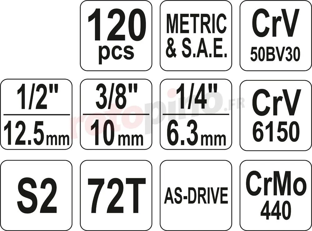- Prises 1/4 « : 4, 5, 6, 7, 8, 9, 10, 11, 12, 13 mm