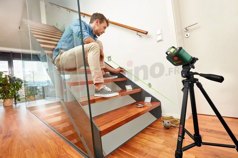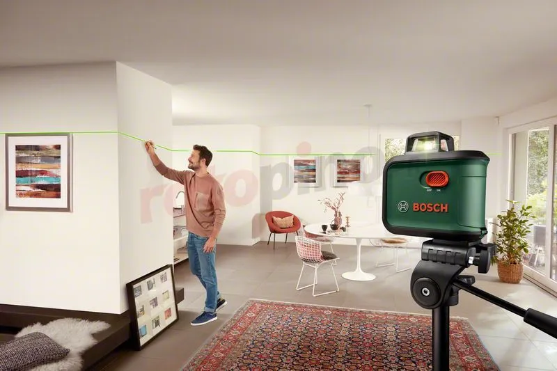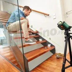 Laser de ligne AdvancedLevel 360 Bosch 0603663B03 est un outil de nouvelle génération moderne et convivial qui répondra aux attentes des utilisateurs individuels exigeants. Il est équipé de diodes laser vertes, d’une plage de travail plus élevée, d’une meilleure qualité de ligne par rapport au modèle PLL 360. Il dispose également d’une configuration étendue de lignes laser. Il trace une ligne à 360 degrés, 2 lignes V (avant et côté, deuxième ligne verticale à 90 degrés) et à l’aplomb (référence croisée de 2 lignes verticales sur le plafond comme «à plomb»). Toutes les configurations laser peuvent être définies en mode pente. Le laser AdvancedLevel 360 est un outil polyvalent qui sera utilisé dans de nombreuses tâches nécessitant de la précision, telles que l’alignement des meubles, l’installation de tringles à rideaux, le marquage avant la peinture et le papier peint, l’installation de carreaux muraux, l’installation de détecteurs de fumée ou l’installation de rampes d’escalier. Le laser Bosch possède un interrupteur à glissière et seulement 2 boutons de commande, qui garantissent un fonctionnement confortable et efficace. L’outil de mesure est également conçu pour être monté sur un trépied avec un filetage 1/4 « .