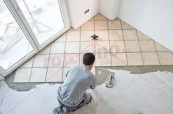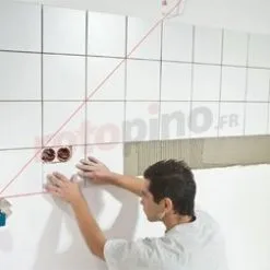 - Projette deux lignes laser perpendiculaires ainsi qu’une troisième ligne à 45° pour un alignement précis et rapide des carreaux, au sol ou au mur