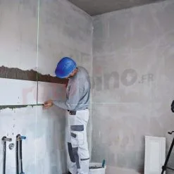 - Le laser permet la projection de 2 lignes (verticales et horizontales) qui se croisent à un angle de 90 degrés et 2 points verticalement