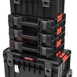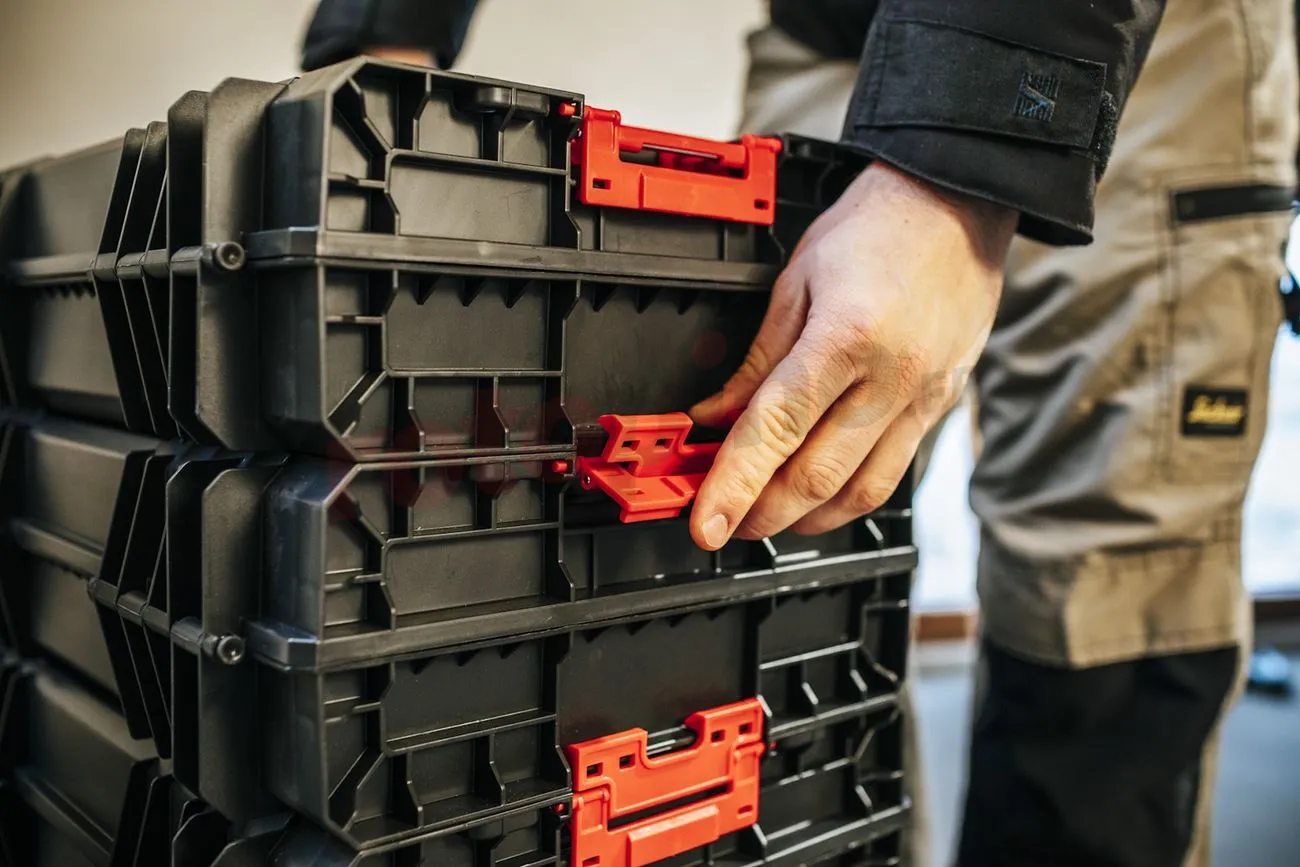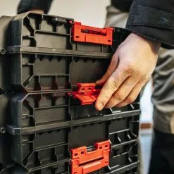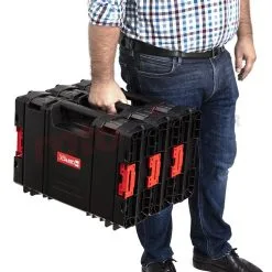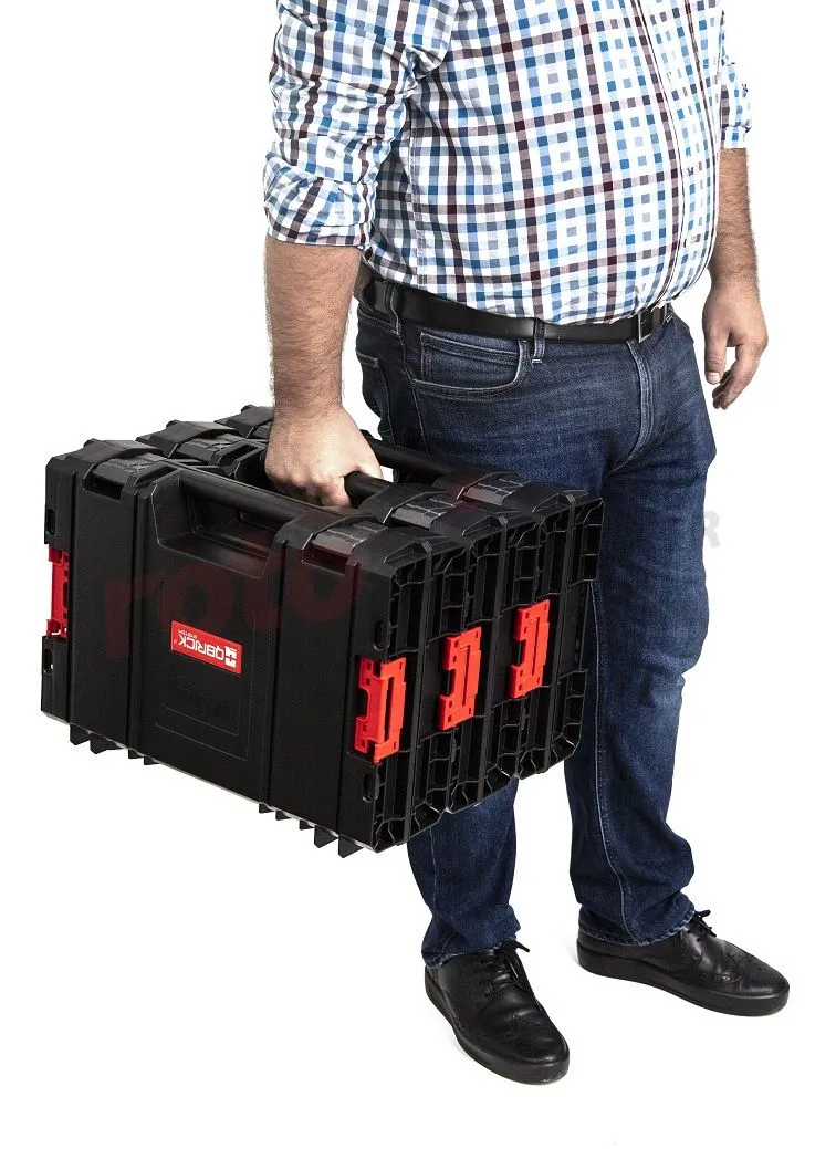- Connecteurs latéraux – crochets polyamide innovants pour une connexion très durable des boîtiers de la gamme PRO de même taille vous permettent de transporter plusieurs boites en même temps