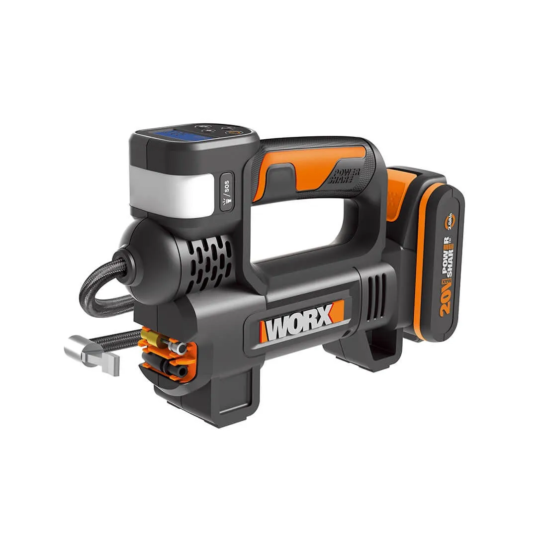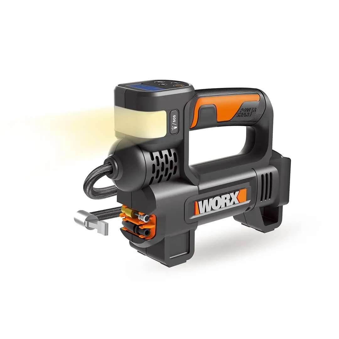 Mini-compresseur WX092 Worx avec lampe de poche LED est un appareil compact et facile à utiliser qui fera ses preuves dans de nombreuses situations d’urgence. À l’aide d’un compresseur, nous pouvons gonfler des pneus de voiture et de vélo, des balles et d’autres jouets gonflables. De plus, nous avons la possibilité d’utiliser un éclairage LED, qui peut servir de lampe de travail et de lampe d’avertissement. Le WX092 fait partie de la série PowerShare, qui comprend des outils alimentés par la même batterie Worx Li-ion 20V. Grâce au fonctionnement sans fil, nous pouvons facilement emporter le compresseur n’importe où. Le compresseur ne prend pas non plus beaucoup de place, il y aura donc de la place même dans un petit garage, une cachette dans un appartement dans un immeuble ou dans le coffre d’une voiture.