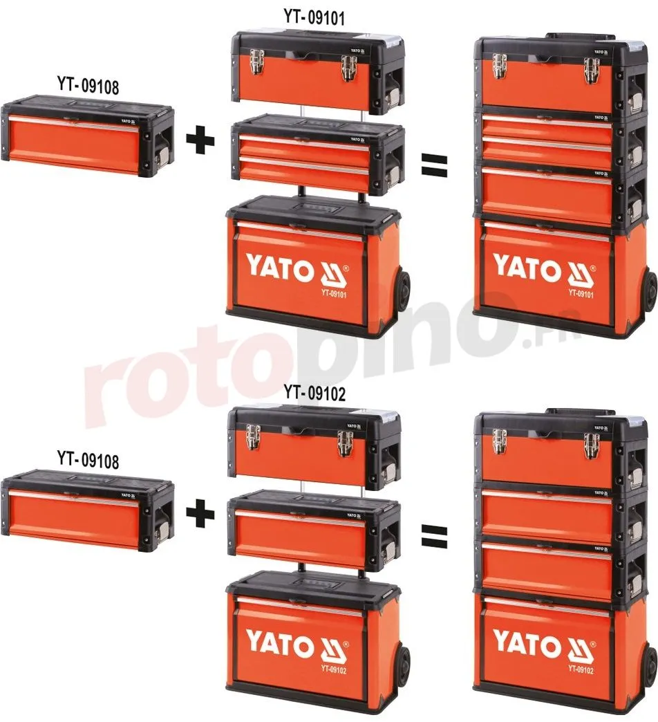 Modulbox YT-09108 Yato Peut être utilisé indépendamment ou faire partie d’un YT-09101 ou 09102 armoire modulaire YT. La boîte comporte un tiroir monté sur des glissières métalliques avec des roulements à billes.