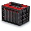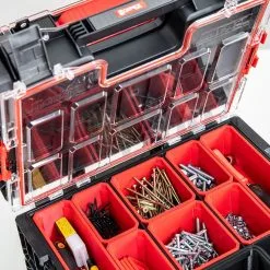 - Compartiements amovibles – 8 compartiements rouges de 3 tailles et 4 types différents permettent diverses configurations interne de l’organiseur,possibilité d’accrocher les cuvettes à un panneau à outils.