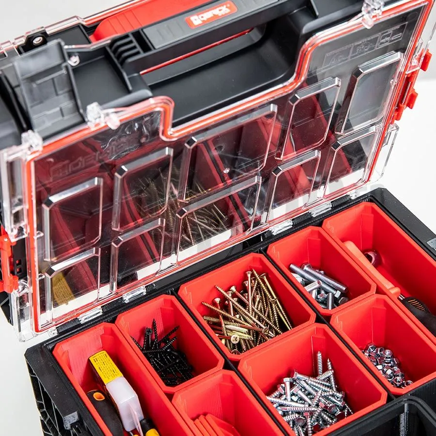 Le plus grand organiseur PRO 300 Qbrick System ORGQPRO300CZAPG003 sera parfait comme boîte à outils indépendante pour les petits accessoires. C’est également un grand représentant du système Qbrick PRO ainsi qu’un excellent complément au système Qbrick ONE. Les compartiements amovibles, similaires aux organiseurs PRO 100 et 200, ont été aggrandis jusqu’à une hauteur totale de 8cm. Cela permet de ranger plus de petites fournitures ou de petits accessoires et outils manuels. Les cuvettes peuvent être accrochées aux panneaux à outils ou à des vis saillantes. Une poignée solide garantit une prise en main ferme et permet de transporter plusieurs organiseurs lourds dans une seule main. Les autres caractéristiques de l’organiseur sont typiques des derniers produits du système PRO.