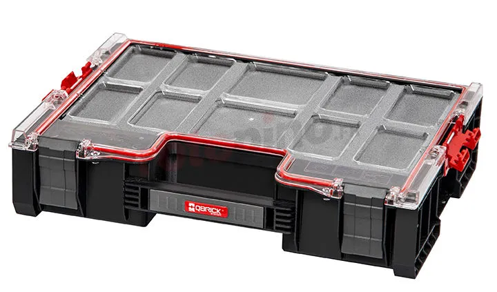 - Couvercle transparent en polycarbonate – résistant aux chocs, suffisamment flexible et complètement transparent maintenant les compartiments en place.