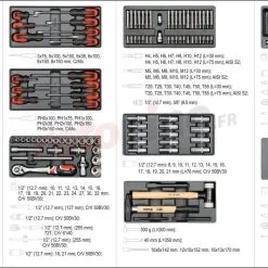- Douilles 1/4″ (6,3mm) : 3,5 ; 4 ; 4,5 ; 5 ; 5,5 ; 6 ; 7 ; 8 ; 9 ; 10 ; 11 ; 12 ; 13 ; 14mm ; Crv 50BV30
