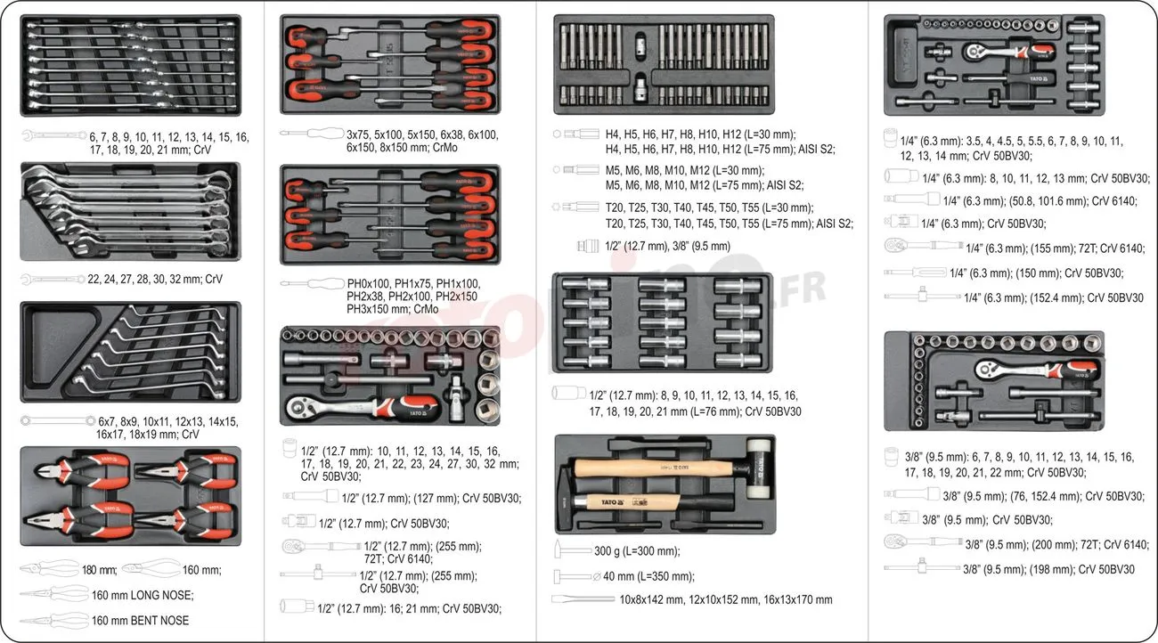- Douilles 3/8″ (9,5 mm) : 6, 7, 8, 9, 10, 11, 12, 13, 14, 15, 16, 17, 18, 19, 20, 21, 22 mm ; Crv 50BV30