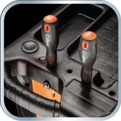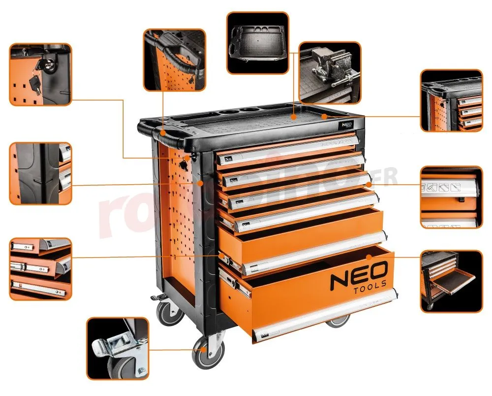 Servante d’atelier Neo 84-223 Solution pratique qui facilitera l’organisation du travail dans chaque atelier ou sur le site. Le coffret se compose de 6 tiroirs fermés au moyen du système de verrouillage centralisé, dans lequel vous pouvez stocker des outils à main. Avec des guides à billes éjectent des tiroirs fonctionne très efficacement, ce qui se traduit par un accès rapide aux outils nécessaires. Un plus sont les roues qui offrent à l’armoire à outils la Neo mobilité.