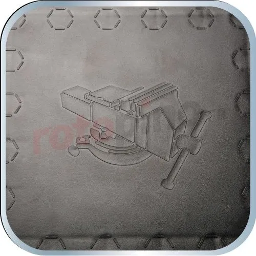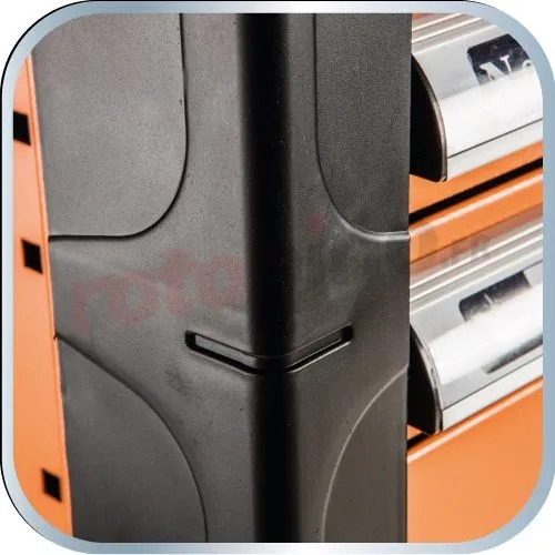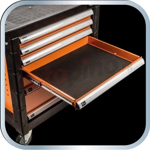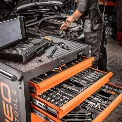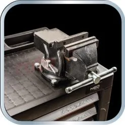 - L’armoire à outils a un fort plan de travail avec des évidements pour les petits accessoires et une place dans l’étau