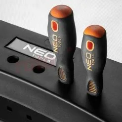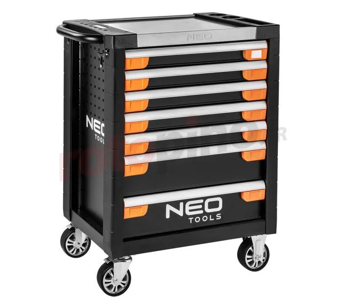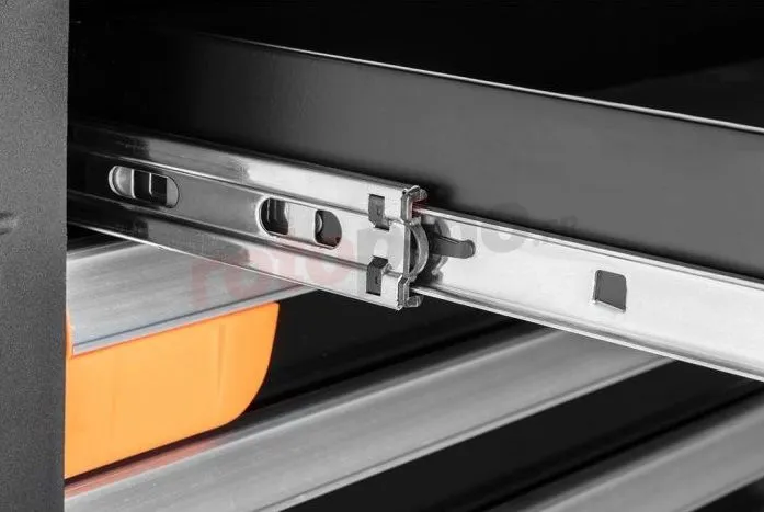 L’armoire à outils PRO Neo 84-220 avec 7 tiroirs sur glissières à roulement à billes assurera un rangement pratique et sûr de divers accessoires. Les tiroirs s’ouvrent en douceur, permettant d’accéder rapidement aux outils dont vous avez besoin. Ils sont équipés d’un blocage qui protège le contenu pendant le transport. La servante dispose également d’un large plan de travail en aluminium avec des cuvettes pour les petits objets et des trous spéciaux pour les tournevis. Le modèle 84-220 Neo est également équipé de 4 roues dont 2 pivotantes et d’une poignée pour un déplacement facile.