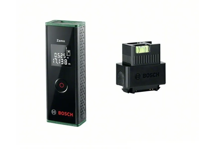 Télémètre laser Zamo III Bosch est la nouvelle génération d’un outil de mesure populaire choisi par les bricoleurs. Cette fois, Zamo a été équipé de la fonction de travailler avec des adaptateurs : ruban à mesurer, roue de mesure et niveau à bulle. Grâce à ces adaptateurs, vous pouvez mesurer des objets autoportants, quelle que soit leur forme, jusqu’à 1,5 m (ruban à mesurer), des objets de formes irrégulières (cercle de mesure), ainsi que mettre à niveau divers objets, par exemple des étagères et des tableaux (niveau). . En plus de ces nouvelles fonctions, Zamo III est adapté pour le calcul de surfaces et de volumes, la mesure en continu et la mesure de longueur. Le télémètre Bosch a un design extrêmement compact, il ne prend donc pas beaucoup de place et peut être transporté dans votre poche. L’ensemble comprend 2 piles AAA, qui l’alimentent, et l’un des adaptateurs – un niveau à bulle. Les deux autres adaptateurs doivent être achetés séparément.