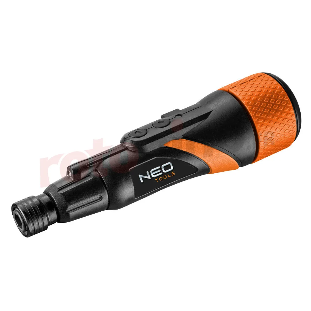 Le tournevis sans fil 04-200 Neo est un outil léger et maniable qui fera ses preuves dans divers travaux d’entretien et de montage. Il dispose d’une batterie lithium-ion 3,6V intégrée chargée avec un câble micro USB. Il y a deux boutons pour faire fonctionner le tournevis – l’un bascule vers la droite et l’autre vers la gauche. Le tournevis Neo peut également être utilisé en version traditionnelle et serrer-dévisser les vis comme un tournevis. Les embouts sont montés dans un support hexagonal 1/4″. Grâce à la conception ergonomique, l’outil est très confortable dans la main.