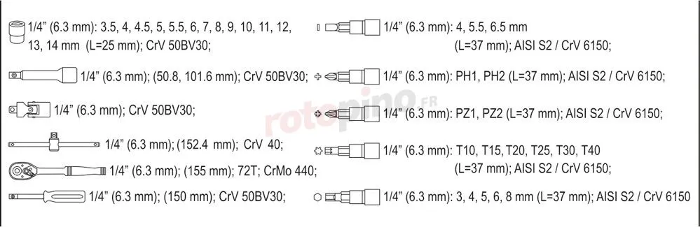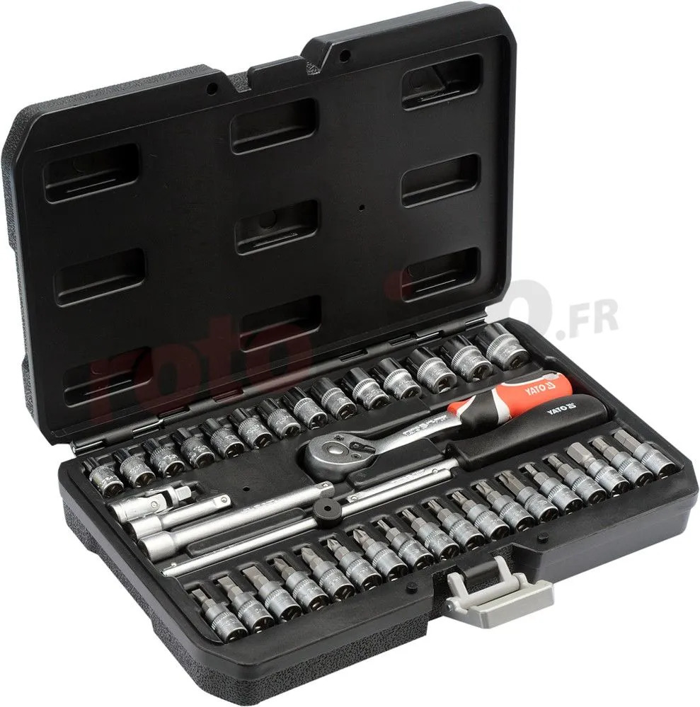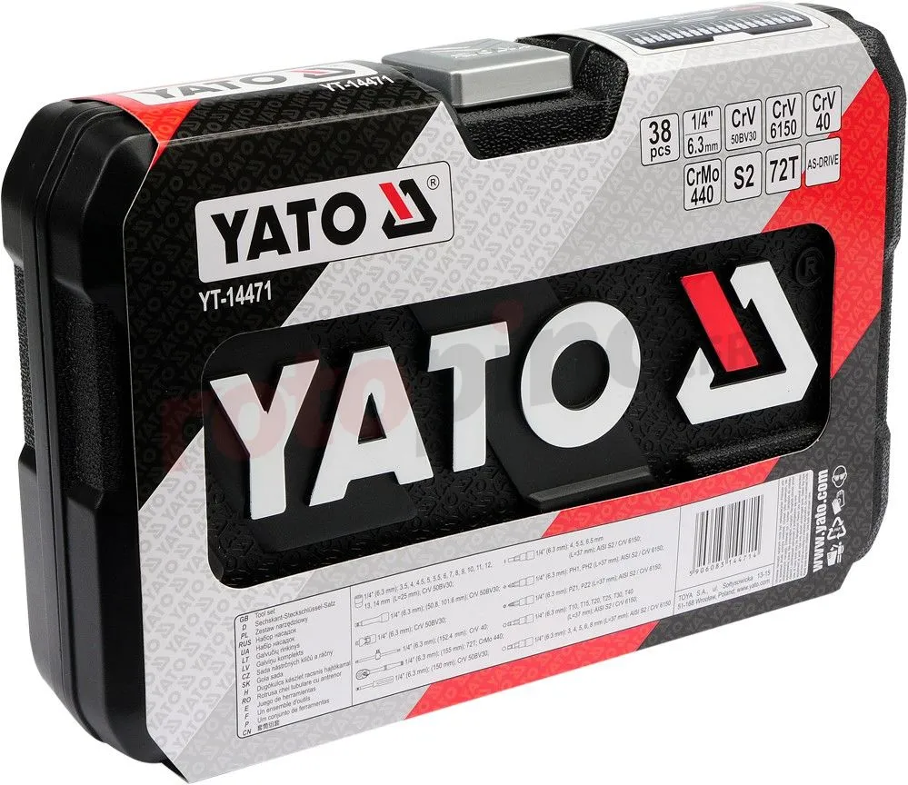 Clé à douilles 1/4 « 38 pcs YT-14471 Yato est dédié aux professionnels. Vérifiez lors de la maintenance et mécanique. L’ensemble comprend, entre autres, 1/4 « prises en chrome-vanadium CrV50BV30, hochet acier CrV 6140, ainsi que des morceaux de disque S2 en acier. Les différents éléments sont disposés dans un boîtier en plastique.